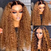 Caramel Brown Water Wave/Wand Curly Lace Front Wig With Dark Root Ombre Color HD Lace Human Hair Wigs for Women-GeetaHair - Water Wave / 150% / 14