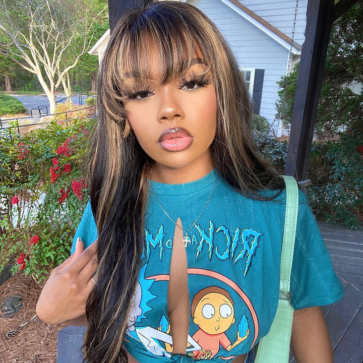 Highlight Brown Body Wave Human Hair Wigs with Bangs Colored HD Transparent Lace Wig - 14 / 150% / 13x4 Lace Frontal