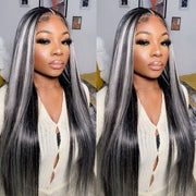 Platinum Gray Highlight 13x4 HD Lace Wig Straight Hair Black With Blond Highlights Lace Front Wig Plucked Natural Hairline With Baby Hair-Geeta Hair - 14 / 150%
